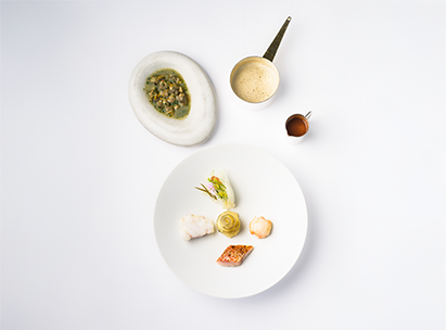 Le Président du Jury Alexandre Couillon avait demandé de travailler une entrée sur le thème « Légume Légume », et un plat en résonance avec la mer sur le thème : « Sur l’idée d’un retour de pêche ».